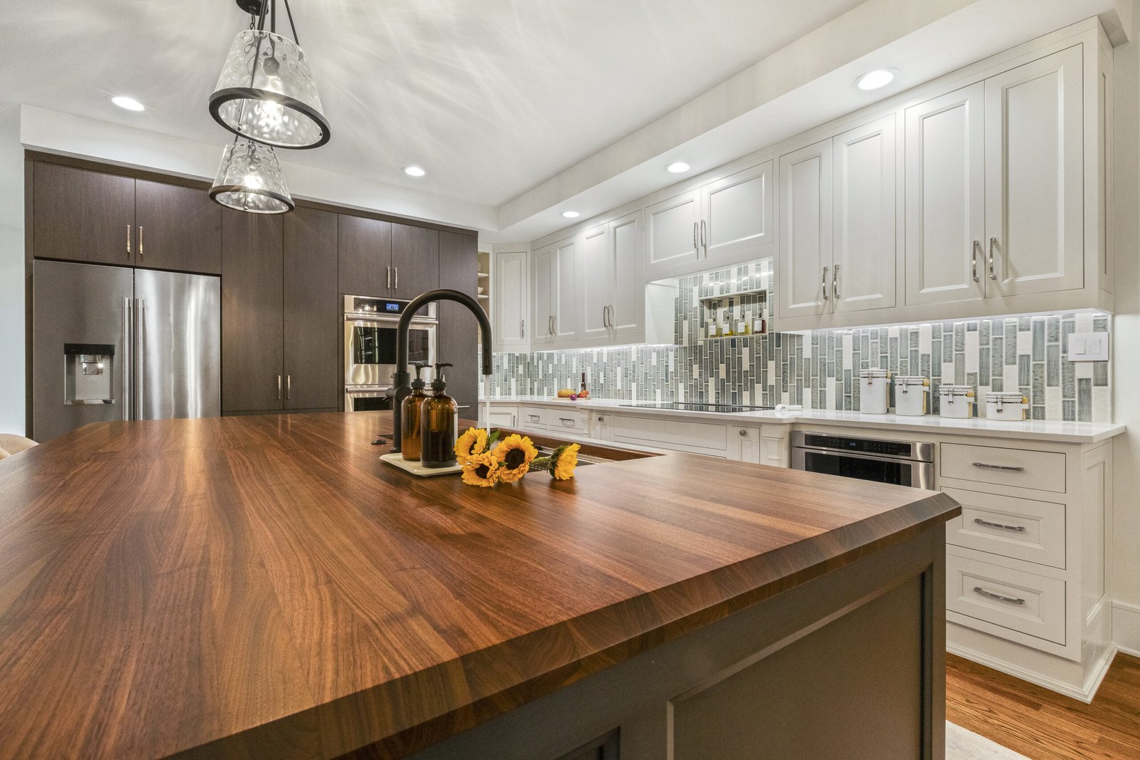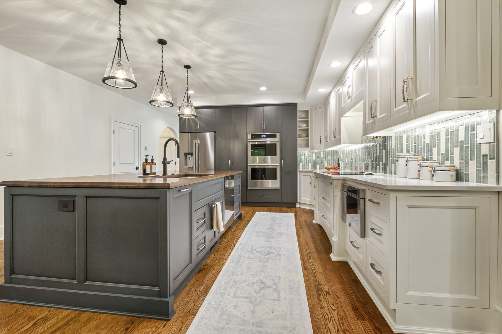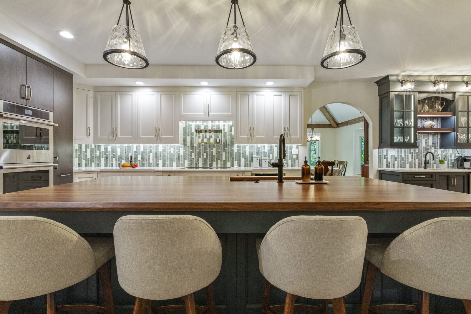 This kitchen forms part of a whole house remodel. This kitchen remodel transforms a dated space into a stylish, modern design. The new design features a spacious island with a warm wood countertop and navy base, offering more seating and workspace.