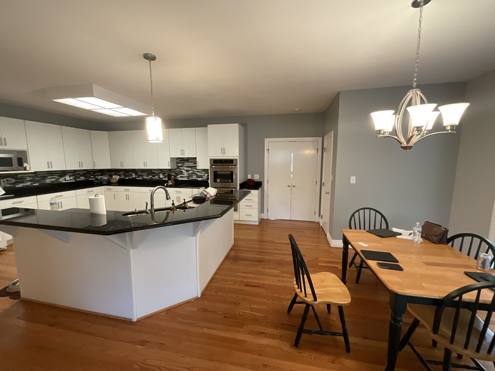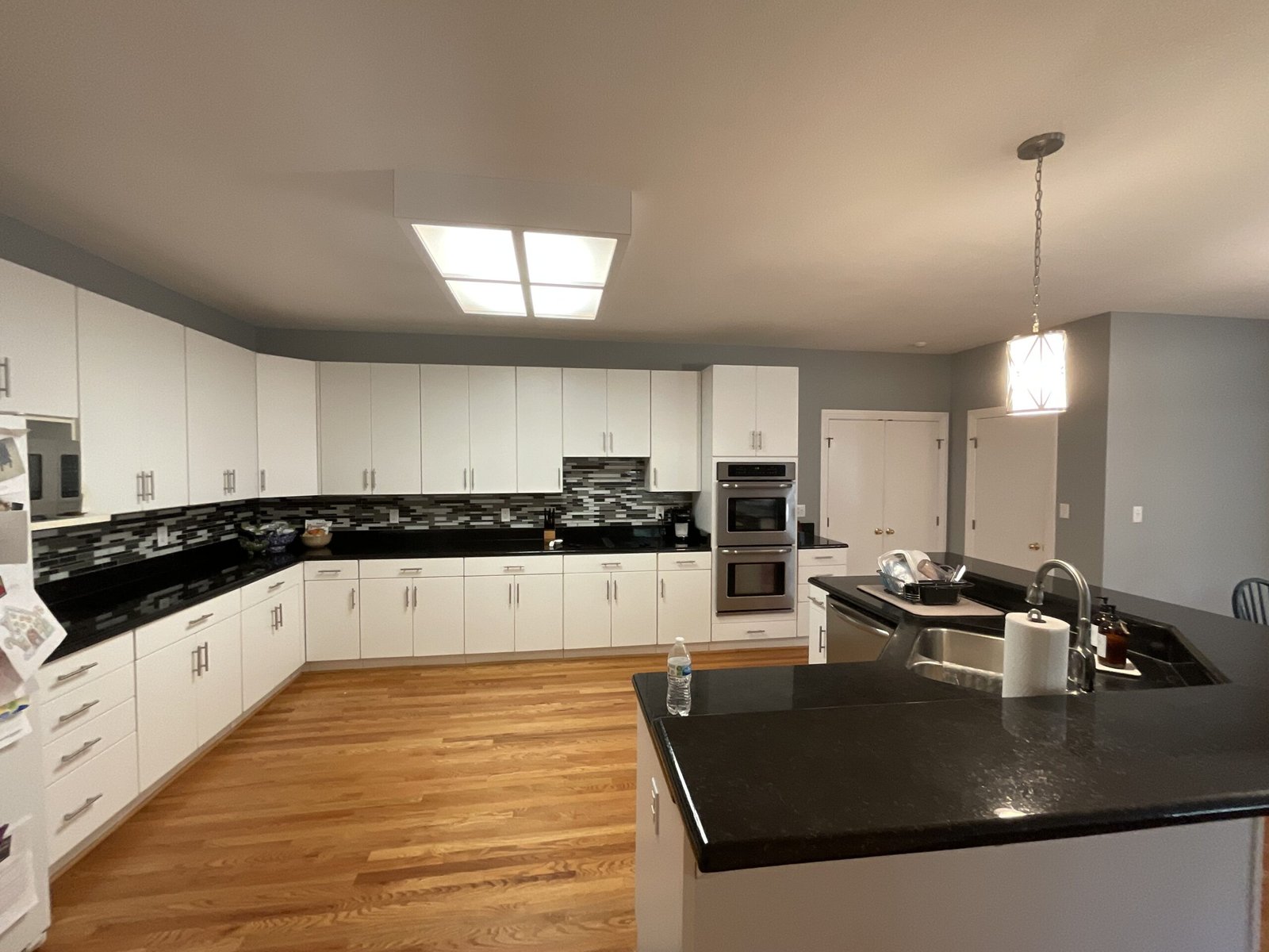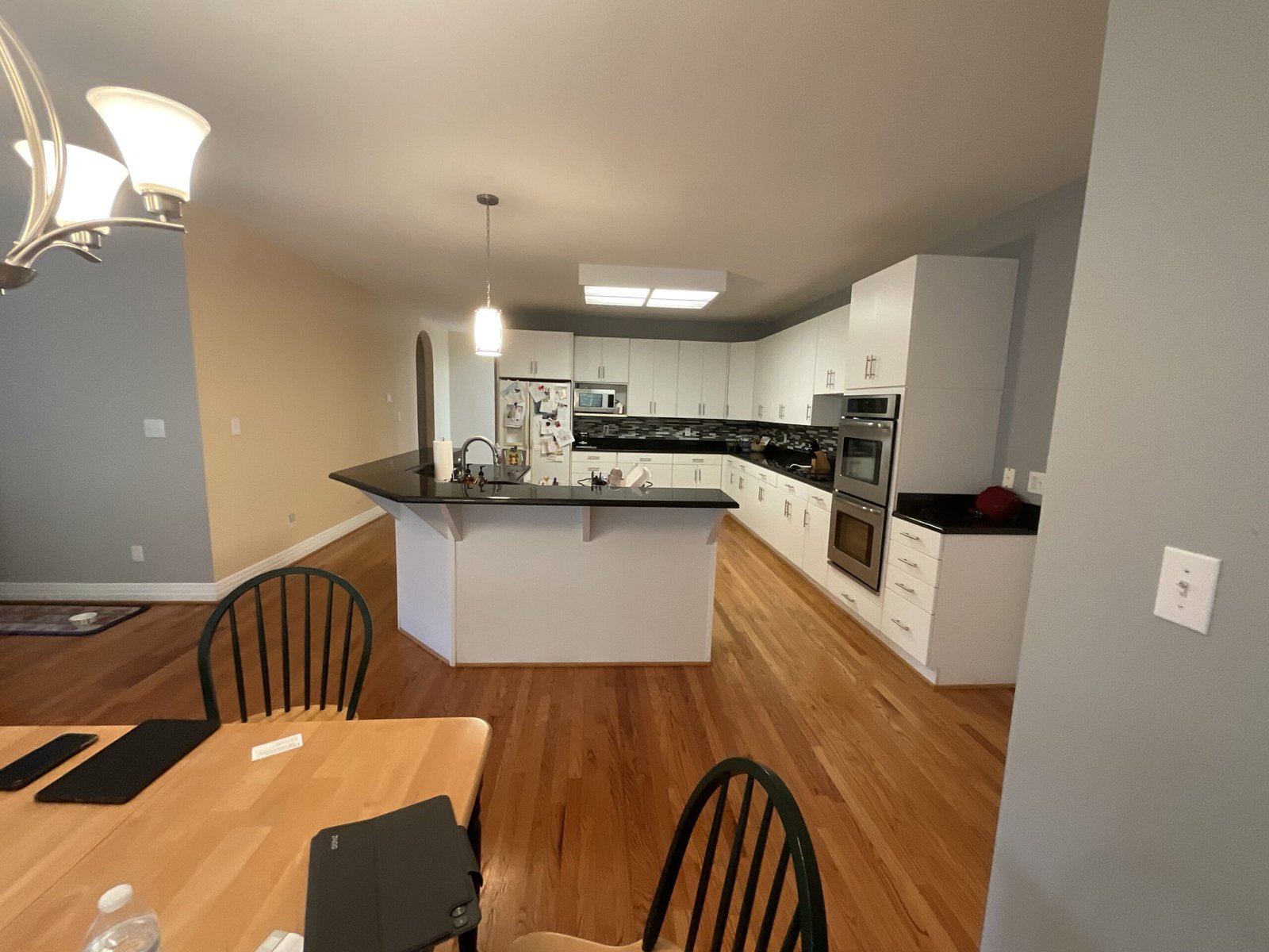 This kitchen forms part of a whole house remodel. This kitchen remodel transforms a dated space into a stylish, modern design. The new design features a spacious island with a warm wood countertop and navy base, offering more seating and workspace.