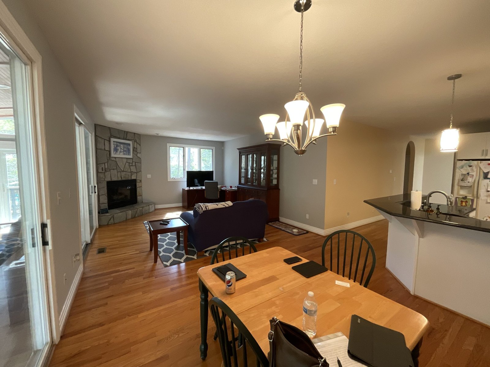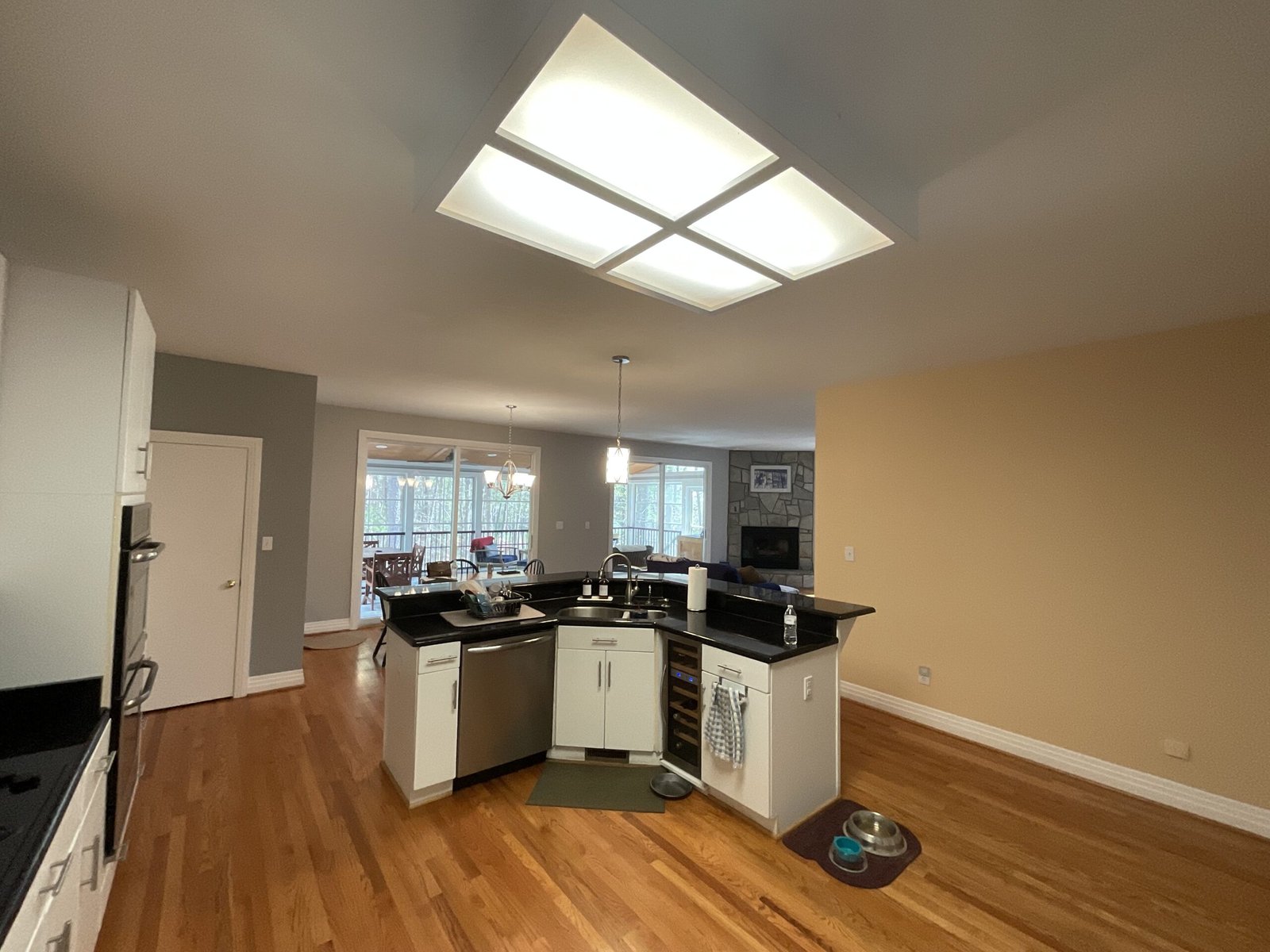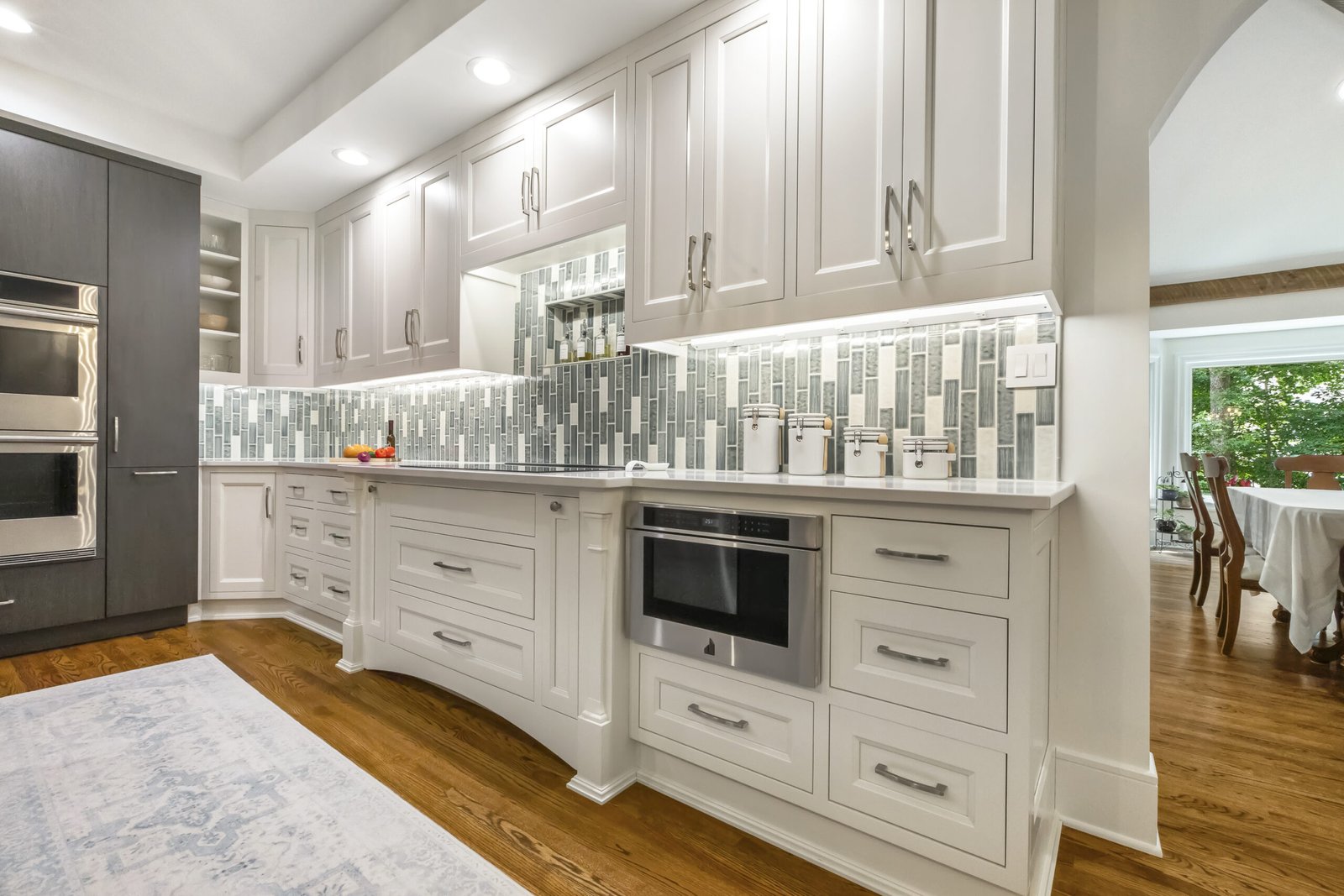 The remodeled kitchen also integrates seamlessly with the dining area, featuring an open archway leading to a bright, inviting dining space with large windows that flood the area with natural light.