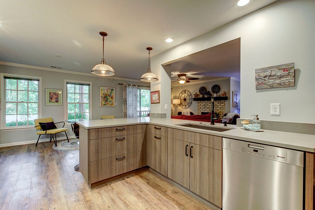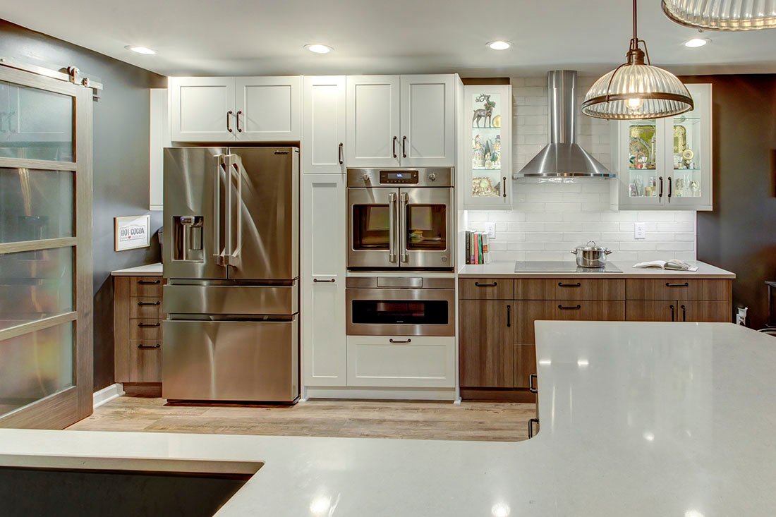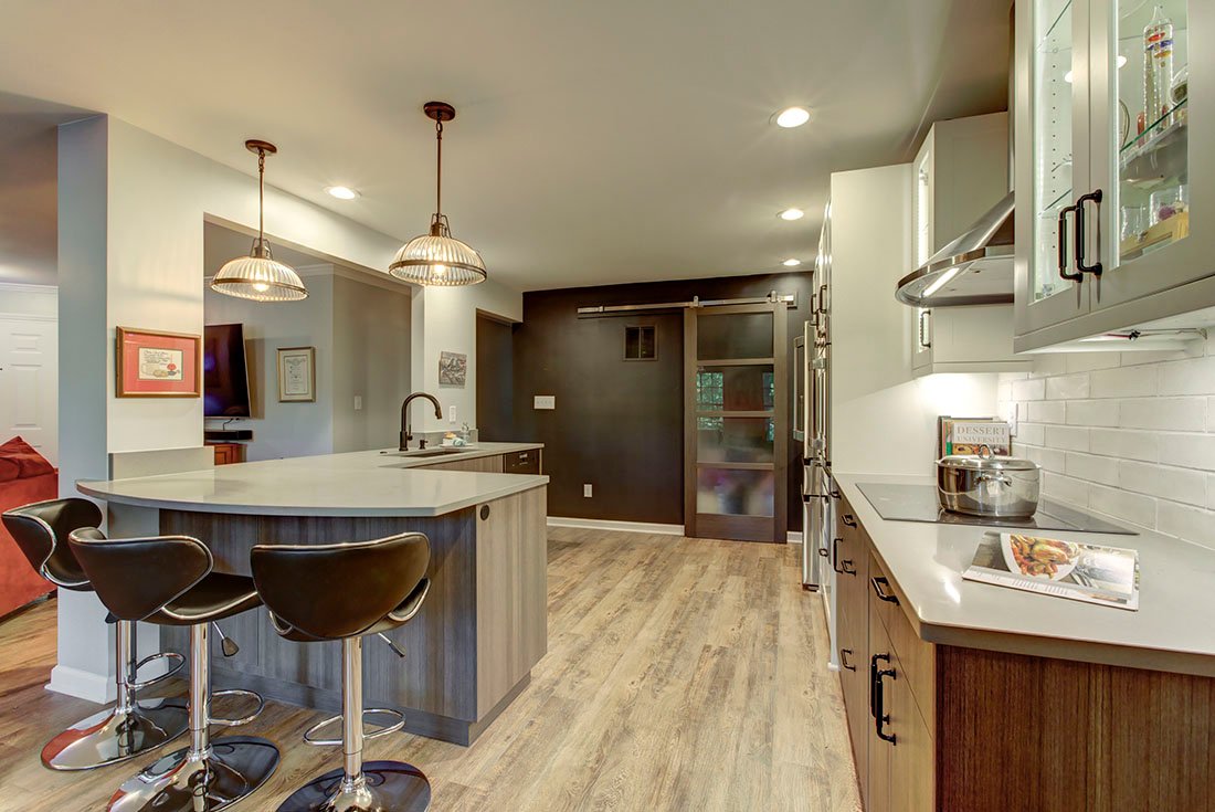 This modern condo kitchen was designed with aging-in-place in mind, prioritizing both function and style. The space was transformed from a closed-off area into an open, accessible layout that accommodates future mobility aids like walkers or wheelchairs. Walls were removed where possible, to integrate the kitchen seamlessly with the living areas, enhancing the stunning lake view. Functional elements include a double door oven with a microwave drawer for ease of use, an induction cooktop for safety, and a refrigerator with a convenient center drawer. Rollout pantry shelves, D-shaped hardware, and textured melamine cabinet doors offer ease of access and durability. A touch faucet, easy-gliding barn door, and hands-free features add to the convenience. Stylistically, the kitchen blends white cabinets with warm wood-look melamine and industrial touches like charcoal walls and concrete counters. Glass door cabinets display family treasures, while frosted glass barn doors and luxury vinyl tile flooring complete the space with a clean yet rustic feel. Ample lighting options and dimmer controls ensure comfort and adaptability as the client’s needs evolve.
