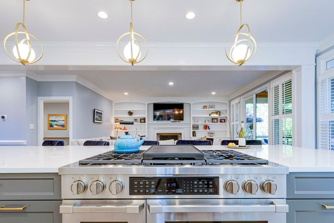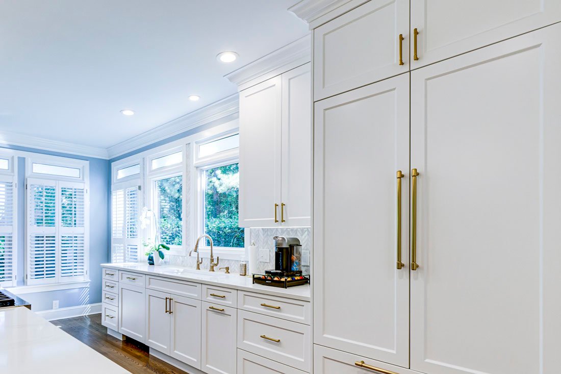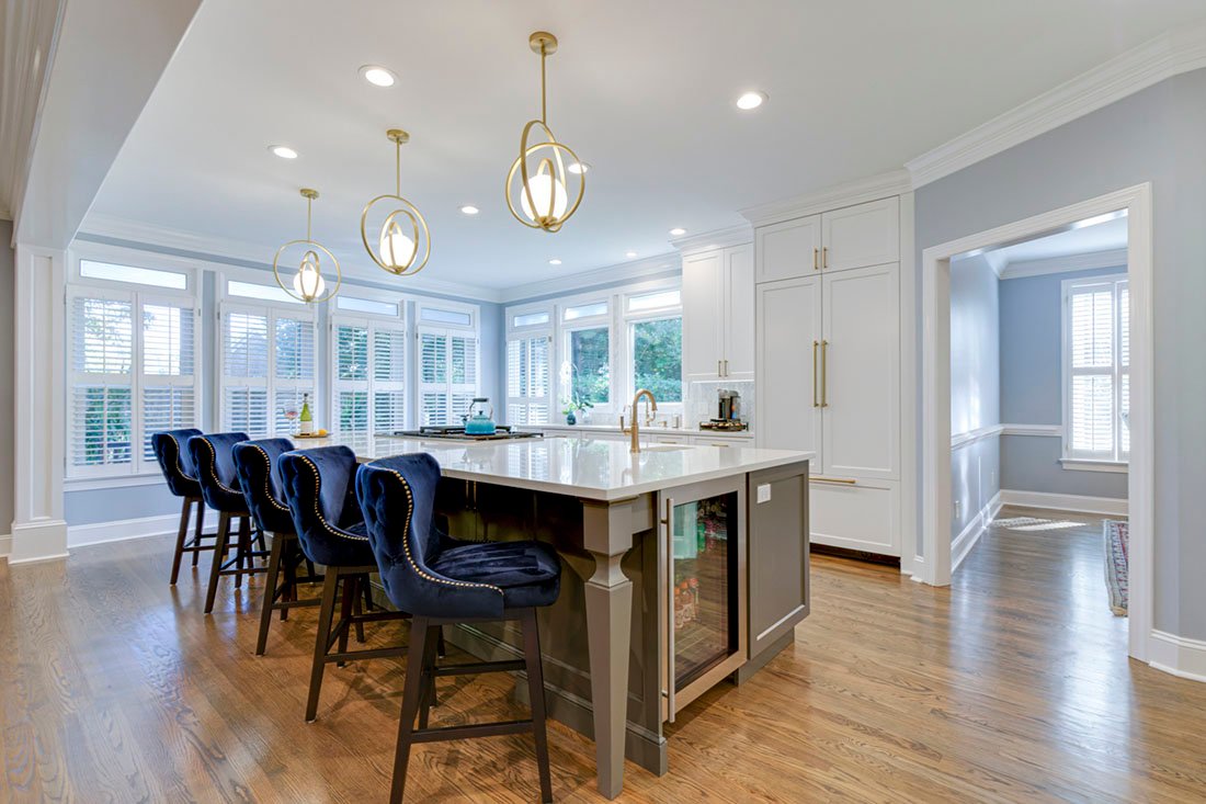 This kitchen remodel transformed a cramped, outdated space into a stunning focal point of the home. By opening the wall between the kitchen and living room, an open-concept layout was achieved. The reconfigured “window wall” allowed for a larger island and expanded counter space.