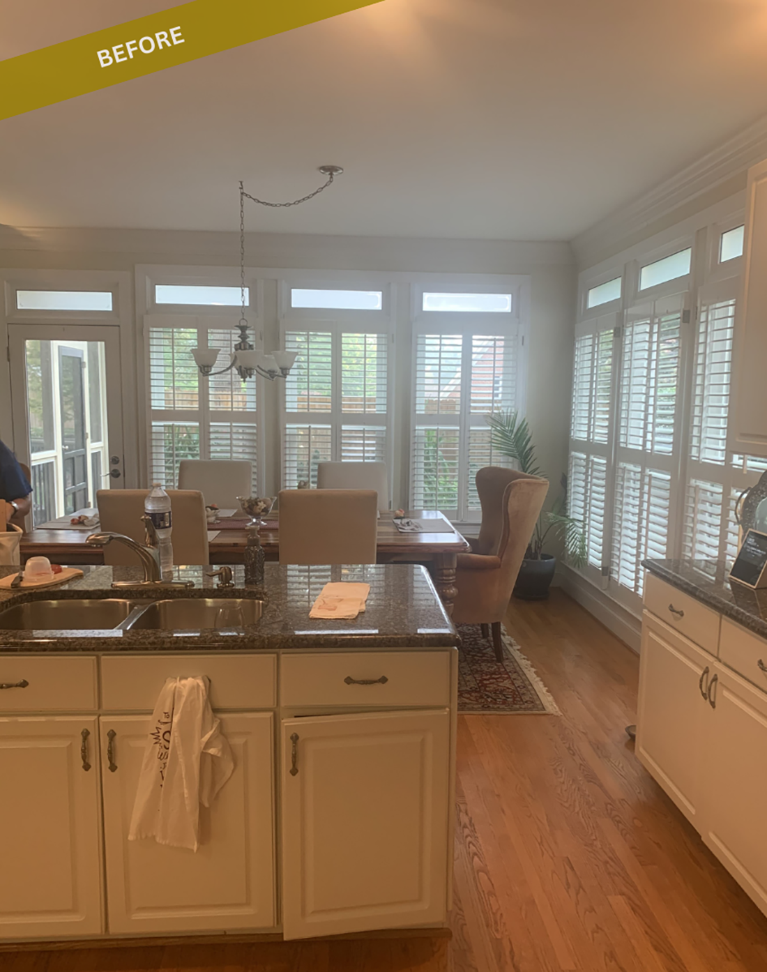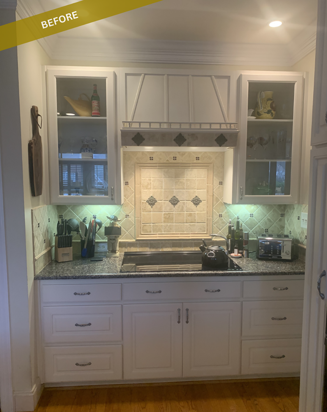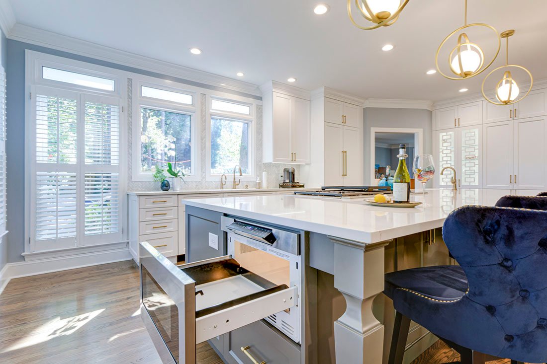 The new design features custom cabinetry in contrasting colors, a 13’ island, and smart storage solutions like tray dividers, adjustable cutlery inserts, and a hidden liquor cabinet. A decorative glass mullion door, while quartz countertops, marble mosaic backsplash, and custom mouldings complete the elegant look. The result is a sophisticated kitchen that perfectly aligns with the homeowner’s lifestyle.