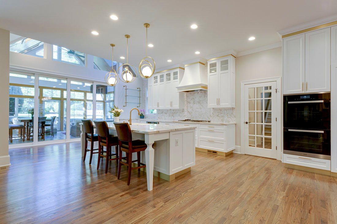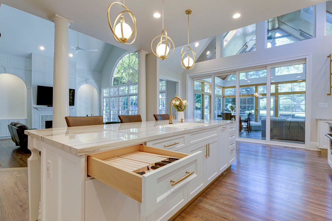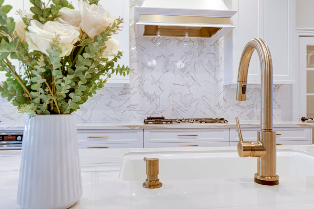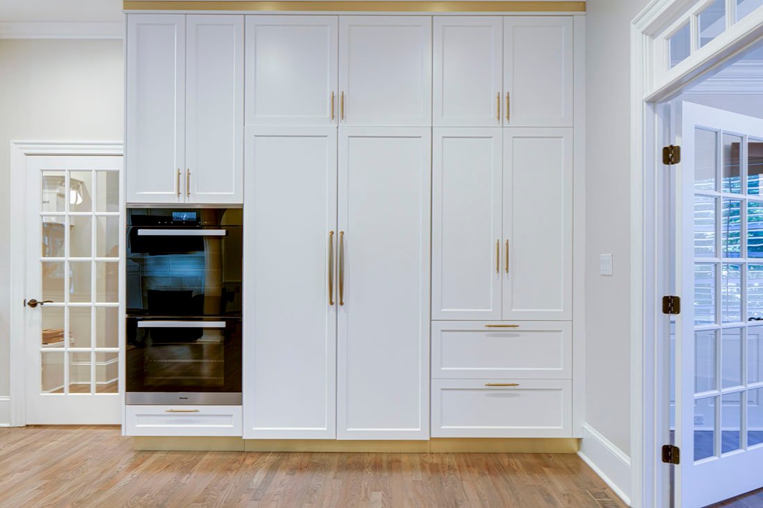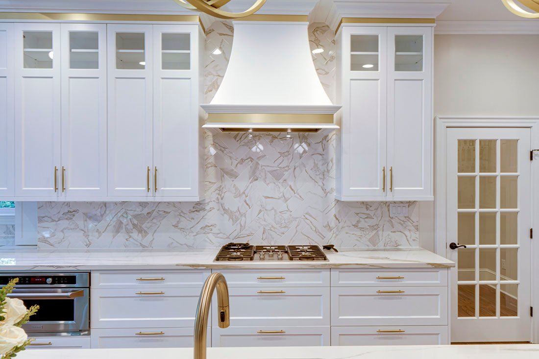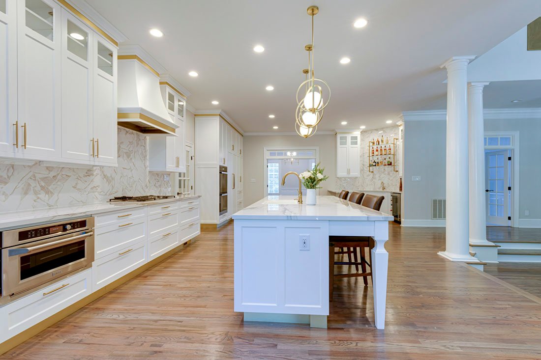 The redesigned kitchen transforms the original cramped layout into a bright, open space perfect for entertaining. By removing walls around the butler’s pantry and adding French doors, the kitchen is connected to the dining room, flooding the area with natural light. The space was further expanded by removing a nook, creating a seamless, airy environment. Low maintenance, high-impact materials include marble-look porcelain countertops with mitered edges and a herringbone-patterned backsplash, complemented by gold accents for added dimension in the monochromatic color scheme. A minimalist design features hidden outlets, paneled-front appliances, and functional accessories like roll-out shelves, tray dividers, and an appliance garage. This glamorous, spacious kitchen is both visually stunning and highly functional, ready for any gathering.